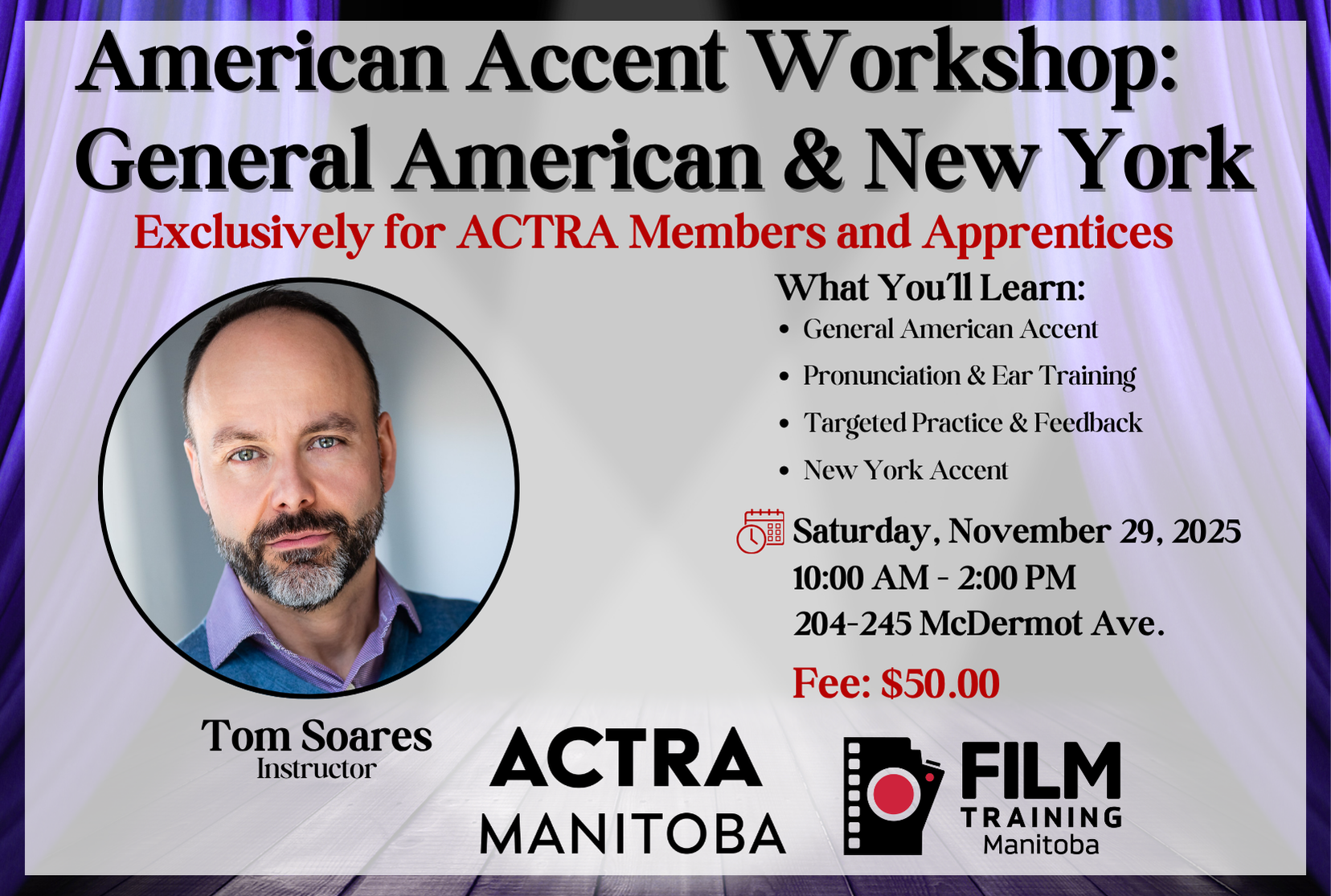 Date: Saturday, November 29 (10:00 AM – 2:00 PM)Location: Film Training Manitoba Office (204 – 245 McDermot Avenue)Cost: $50.00For ACTRA Manitoba Members & Apprentices only! About the Workshop: An actor’s ability to confidently perform with an American accent is a key skill for landing roles in the film industry. In this 4-hour workshop, we’ll focus on …