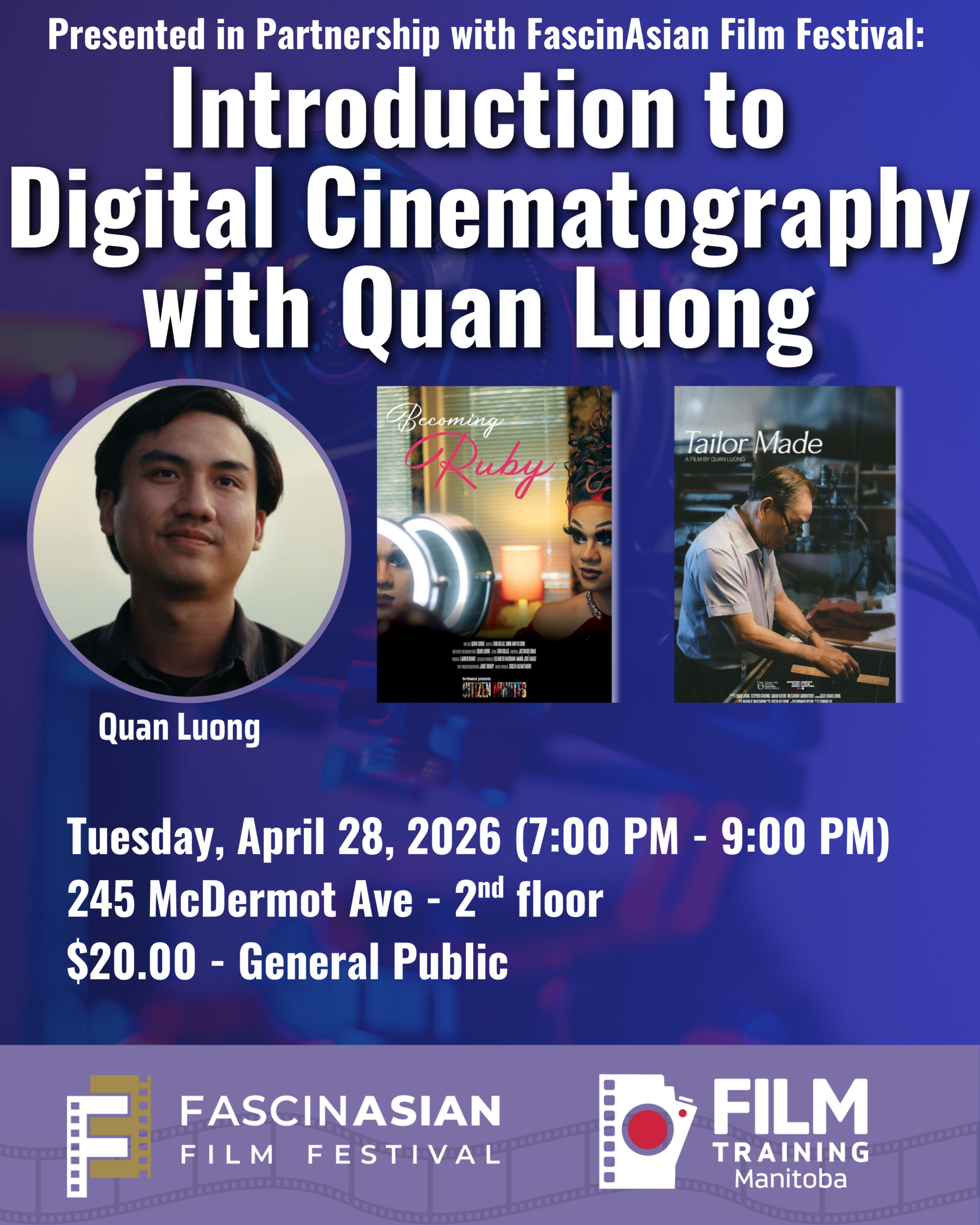 Date: Tuesday, April 28, 2026 (7:00 PM – 9:00 PM) – Networking reception afterwardsLocation: 204-245 McDermot Ave. – 2nd floorRegistration Fee: $20.00 (General Public)*FascinAsian Film Festival pass holders get in free (Register using form below) About the Workshop: Join award-winning Vietnamese-Canadian Cinematographer as he takes you through the basics of shooting with digital cameras, including …