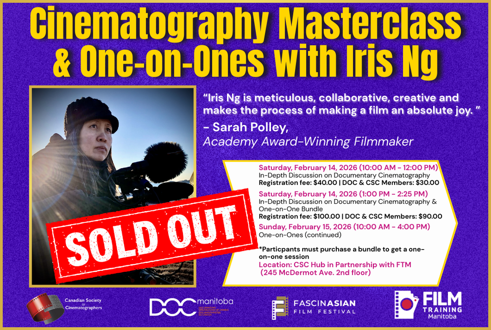 Manitoba’s film industry training and workforce development organization, Film Training Manitoba (FTM), is pleased to announce Iris Ng as our distinguished masterclass instructor for 2026 in partnership with DOC Manitoba and FascinAsian Film Festival. FTM annually conducts special masterclasses with highly innovative film industry professionals. These sessions help develop the skills of Manitoba’s film industry …