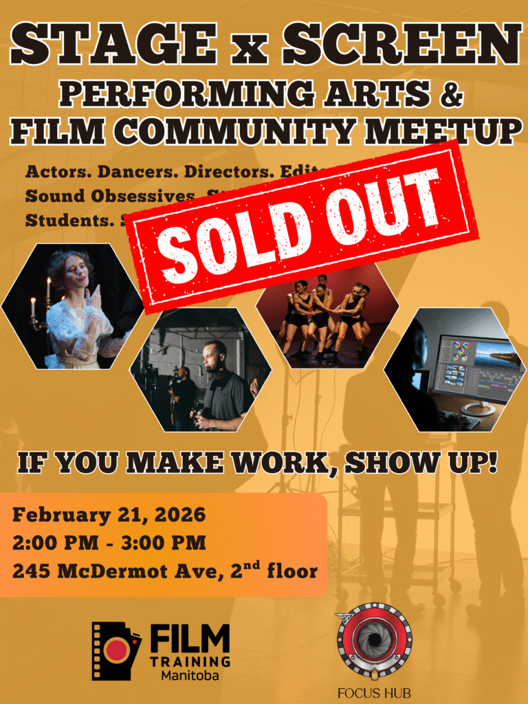 Calling all performers, filmmakers, and creative folks! Focus Hub Inc. and Film Training Manitoba are teaming up to launch a new meetup for people working in (or curious about) the performing arts and film industries.