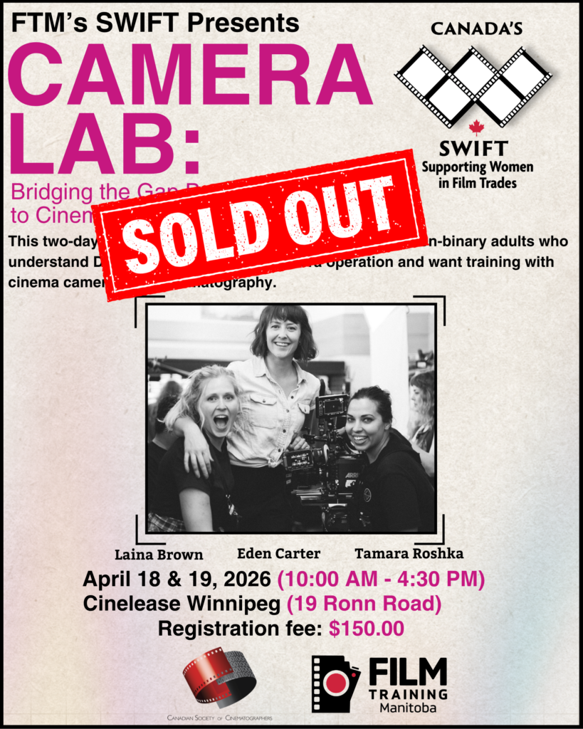 FTM is a non-for-profit charity and member of the Province of Manitoba’s Sector Council program funded through the Economic Development, Investment, Trade and Natural Resources. FTM builds a highly skilled and adaptable film industry workforce to support the activities of Manitoba production companies. FTM collaborates and partners with members of the film industry to identify training needs to support workforce development.